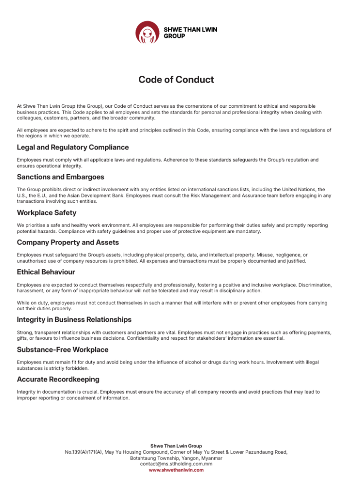At Shwe Than Lwin Group (the Group), our Code of Conduct serves as the cornerstone of our commitment to ethical and responsible business practices. This Code applies to all employees and sets the standards for personal and professional integrity when dealing with colleagues, customers, partners, and the broader community.