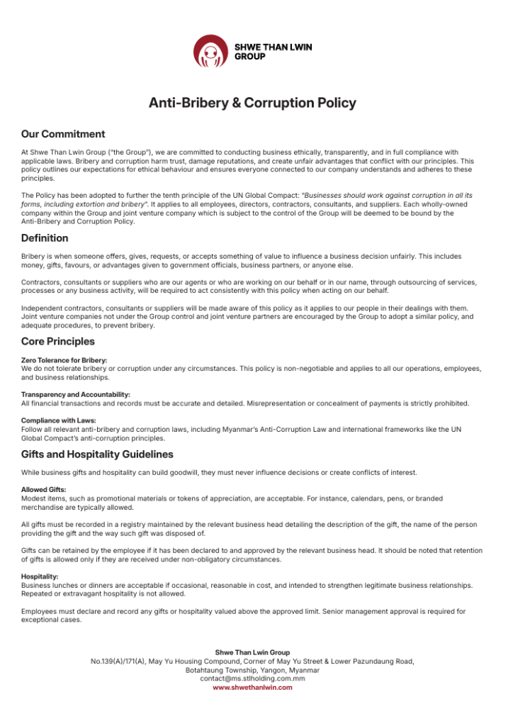 At Shwe Than Lwin Group (“the Group”), we are committed to conducting business ethically, transparently, and in full compliance with applicable laws. Bribery and corruption harm trust, damage reputations, and create unfair advantages that conflict with our principles. This policy outlines our expectations for ethical behaviour and ensures everyone connected to our company understands and adheres to these principles.